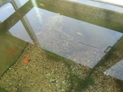 また、中庭の池の中でくらしていたメダカも、5年生のまちにお引っ越しをしてきました。体の色や大きさがちがっていて、泳ぐ姿がとてもゆるやかです。