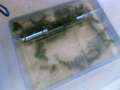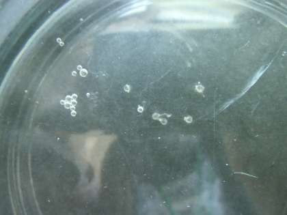 水そうの側面が、うっすらと緑がかってきました。メダカたちはすいすいと水中を元気に泳いでいます。泳いでいるめだかを観察していると、しりびれの当たりに、かわいい卵が数個。見つけた卵をシャーレにうつしました。