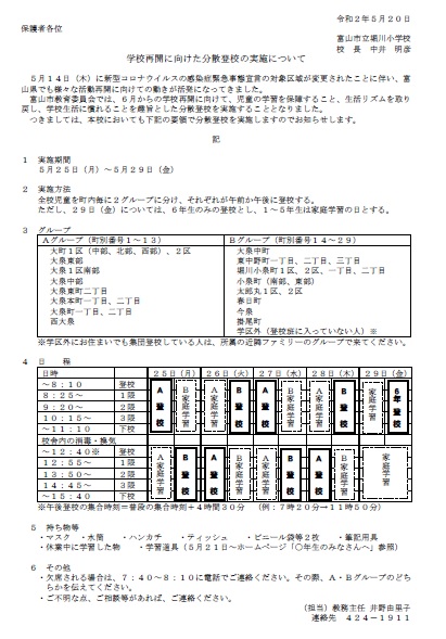 富山市教育委員会では、6月からの学校再開に向けて、児童の学習を保障すること、生活リズムを取り戻し、学校生活に慣れることを趣旨とした分散登校を実施することとなりました。