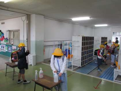 子供たちは、しっかりと消毒をして校舎に入りました。