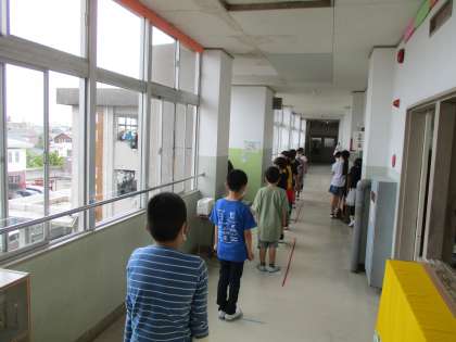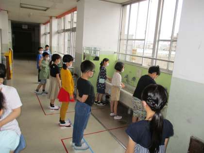 5/25 3密を防いで(三年生のまち) 公開日 2020/05/25 更新日 2020/05/25 3年生 午前と午後に分けて半数が登校しています。手洗いをする時は、足跡マークを守って静かに待っていました。