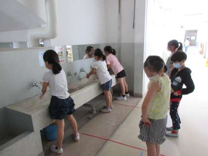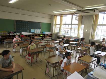 25(月)から分散登校が始まりました。久しぶりの登校でしたが、子どもたちの元気な様子が見られました。隣の人と距離をとって座ったり、手洗い場でも目印を意識して並んだりするなど、安全に気を付けて過ごしていました。算数や漢字の学習でも集中して取り組もうとする姿からは、学校のくらしをがんばっていきたいという思いが感じられました。