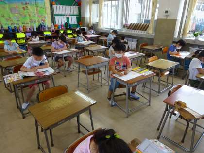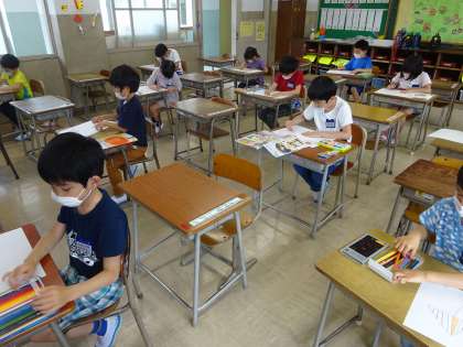 1年生にとっては、初めての図工の学習です。子どもたちは画用紙に自分の描きたいものや好きなものを思い思いに描いていました。