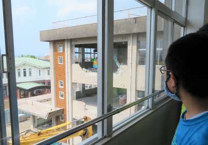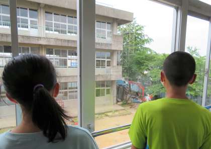 仮設校舎でくらしていると、これまで使っていた校舎の様子や、改築工事の様子等は、なかなか分かりません。ついこの間まで自分たちが使っていたプレイルームや学習室が壊されている様子や、目の前で工事を進めておられる方々の様子を見て、子どもたちはいろいろなことを感じたようでした。