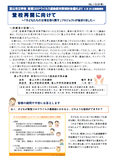 富山市では、未だ解明されていない新型コロナウイルス感染症に対し、児童生徒等が安心して学び、心身共に健康に学校生活を送ることができるよう、富山市立学校新型コロナウイルス感染症対策検討会議(以下「検討会議」という) を設置しました。