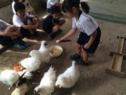 子供たちにとって思い出深い飼育小屋の「いま」の様子です。取り壊され、平地となっています。飼育小屋では、これまで、たくさんの鳥類が飼育されていました。近年は、たくさんの烏骨鶏が飼育されていましたし、過去には、子供たちから恐れられていたヒロという雄鶏も飼育されていました。「むかし」は、平成27年の飼育小屋で、烏骨鶏と一緒に行った学級集会の様子です。Sさんは、烏骨鶏にごちそうの感想を聞いていました。