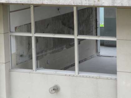 「いま」の1年1組教室です。黒板、掲示板、窓、天井等がはがされ、コンクリートの本体と窓枠を残すのみとなりました。