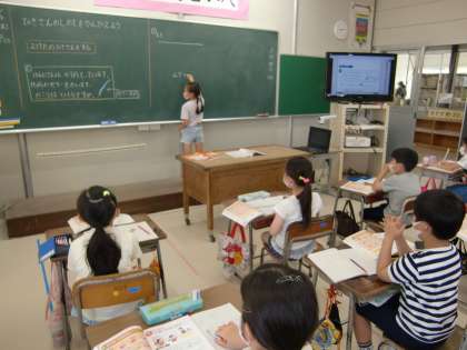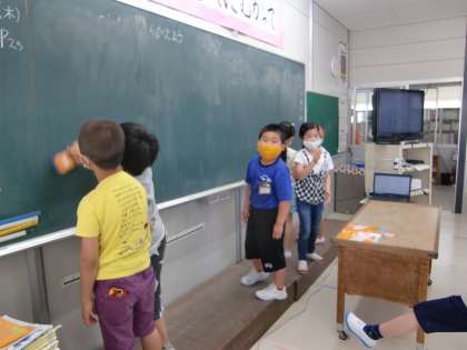 先生になって問題の答えを教え合っています。学習後もみんなで協力しながら後始末をしています。