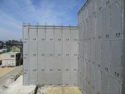 「いま」の西棟と中央棟の南側は、防音ネットで覆われてしまいました。4階の音楽室もどこにあったのか分からなくなってしまいました。極力、音が外にもれないようにして解体工事が進められています。