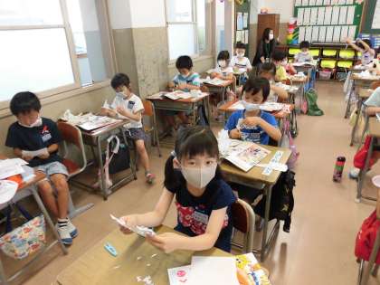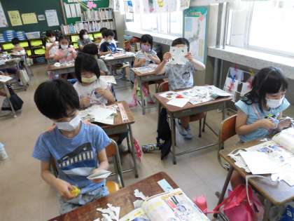 ちょきちょきかざり 公開日 2020/06/10 更新日 2020/06/10 1年生 図画工作科で「ちょきちょきかざり」の学習をしています。 折り紙を折って、はさみで切り取り、広げてみると、素敵な模様になりました。 次回の図工では、作った折り紙をつなげて飾る予定です。