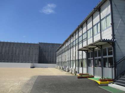 「いま」は、グラウンド南側からの仮設校舎の様子と仮設校舎側から見たグラウンド全景です。今後は、仮設校舎に緑のカーテンができあがっていく予定です。