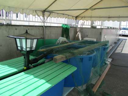 コイは、プール横の仮設水槽に移動しました。