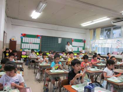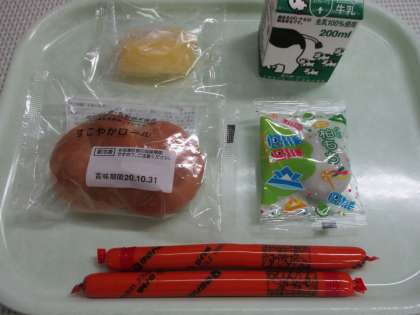 今日のメニューは、ロールパン、ウインナーソーセージ、かしわもち、冷凍リンゴ、牛乳でした。1年1組の様子です。食べ終わると、器用に袋をまとめていました。