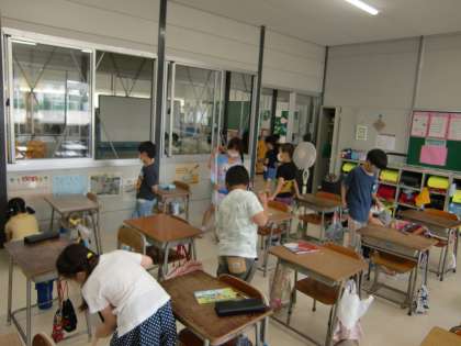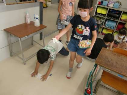 みんなで協力(2年生) 公開日 2020/06/12 更新日 2020/06/12 2年生 画用紙にクレヨンを用いてたまごの絵を描いてはさみで切り取った後の教室は少し汚れてしまいました。気がついて、早速掃除に取り組みました。