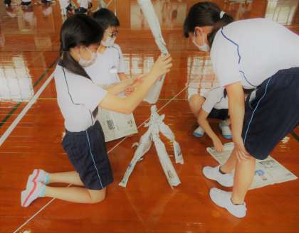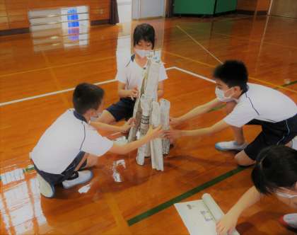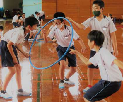 仲間と息を合わせて(6年生) 公開日 2020/06/13 更新日 2020/06/13 6年生 新しい生活様式や梅雨入りの影響で、思い切り体を動かして楽しむ機会が制限される最近。なんとか、楽しい活動ができないかと、フラフープや新聞紙を使った活動に取り組みました。 仲間と息を合わせてフラフープを指1本で支えて上下に動かしたり、新聞紙だけを使って作ったタワーの高さ比べをしたりしました。 子どもたちの笑い声が響く、楽しい時間になりました。