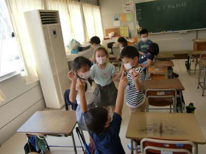 次にレベルをワンランク上げて、ファミリーの仲間と4〜5本のネームペンを人差し指で持ち上げました。頑張りました。