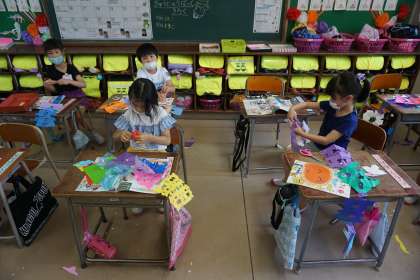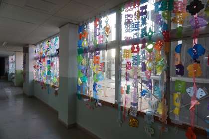 今日は先週から作り始めたちょきちょきかざりが完成しました。子どもたちは思い思いの色や形をつなげ、すてきな作品ができました。