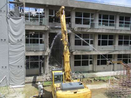 東棟の取り壊しが進んでいます。今日は、どろんこ広場側からも始まりました。ジャングルジムがあっという間に鉄くずになってしまいました。なかよし級の子供たちは、これまで使い慣れた教室や遊んだ遊具が無くなることに寂しさを感じていたようですが、器用に重機を扱って取り壊し作業を行う重機オペレーターや重機の下で瓦礫や重機に水をかけ続ける作業員の方々の仕事ぶりに、興味津々のようでした。