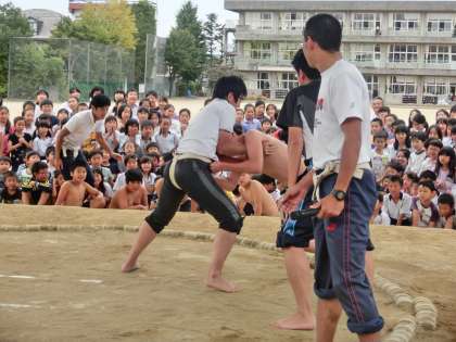 「むかし」は、平成26年に、大会に出場する相撲部への壮行会を兼ねて、相撲部6年生対教員で壮行試合をした様子です。土俵上で四股やすり足を披露した後、壮行試合を行いました。相撲をとっているのはM上先生。M上先生と対戦し、頭をつけ、両前みつをがっしりとつかんで粘っているのは、当時6年生だったT君。行司審判はK田先生。マイクをもって説明しているのはT部先生でした。相撲部員を応援しようと、たくさんの子供たちが土俵の周りに集まって大きな声援を送っていました。