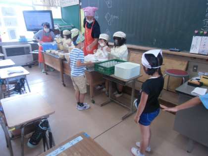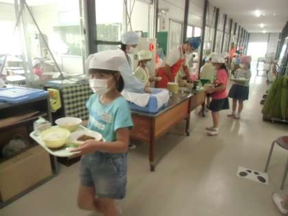 新しい生活様式 給食盛り付け編 6/22(月) 公開日 2020/06/22 更新日 2020/06/22 職員室 今日から調理された温かい給食をいただきました。給食当番の仕方や配膳の間隔の取り方等を見直し、気を付けて準備を進めました。初日だったので少し時間がかかったようですが、久しぶりの美味しい給食に、子どもたちの満足げな表情が印象的でした。