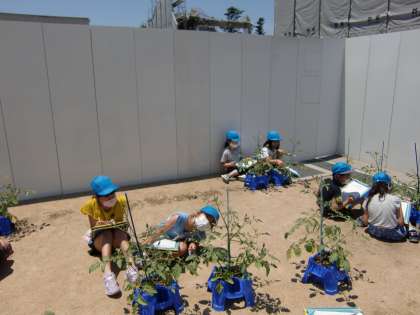 日に日に成長するミニトマトの様子を観察しました。葉や茎を手で触ったり、花の数を数えたり、いろんな方向から見るなど、じっくりと観察することができました。