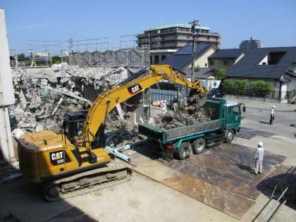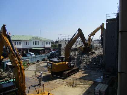 正面玄関は、瓦礫の撤去が始まりました。東棟は、トイレの取り壊しが行われています。現在使っている校舎との境目の取り壊し作業が丁寧に進められています。
