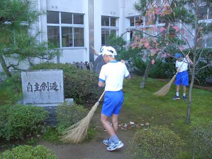「むかし」は、平成18年の朝活動の様子です。6年生が前庭の掃きに掃除に黙々と取り組んでいました。