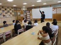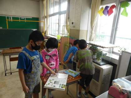 朝、登校すると、キャベツにいたはずのモンシロチョウのさなぎが、成虫になって、カーテンにくっ付いていました。「白くてきれい」とその姿に見とれ、「こんなに早くチョウチョウになるんだね。」と驚く1年生と3年生。「このままだと、どこかに飛んでいってしまうよ。」と大慌てで、モンシロチョウのすみかを準備する4年生と6年生。
