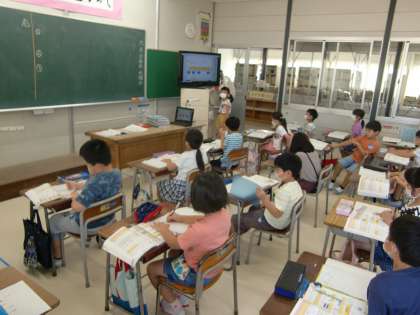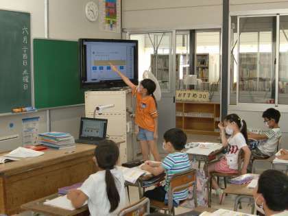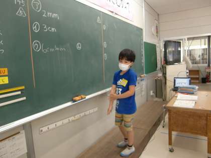 算数の学習では(2年生) 公開日 2020/06/24 更新日 2020/06/24 2年生 「長さをはかってあらわそう」の学習では、「1センチが4個分で4センチになり、1ミリが7個分で7ミリになり、答えは4センチ7ミリになります。」と言ったように、問題の答えを黒板に書く担当と説明の担当に分かれて、学習を展開しています。みんなで、協力しながら学習に取り組んでいます。