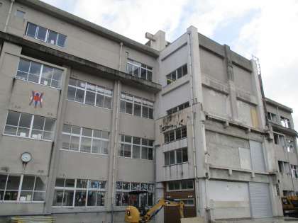 正面玄関が取り壊され、瓦礫も取り除かれました。基礎は残っていますが、既存の校舎とのつなぎ目がはっきりと分かるようになってきました。既存校舎(中央棟東側と東棟北側)の1階は1年生、2階はなかよし級、3階は3年生、4階は5年生がくらしています。