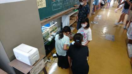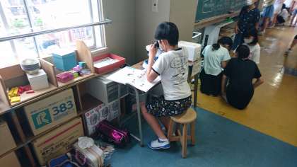 理科の学習で「魚のたんじょう」を学習しています。グループでメダカを育て、卵からの成長を観察しています。教科書には卵の成長過程がきれいな写真付きで載っていますが、子どもたちは、肉眼ではなかなか見られない実際の卵を観察しようと、顕微鏡を利用しています。目ができている様子や血液が流れている様子を見ると、生きている命としてメダカを見始めました。
