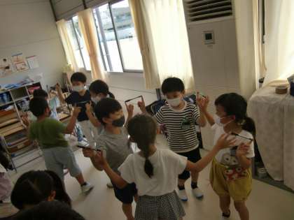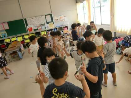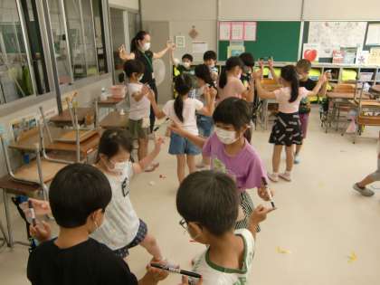 先週か引き続きETゲームに取り組みました。今日は、ファミリー班の仲間(4〜5人)でネームペンを持ち上げて時計のように2周歩いて廻ることでした。みんな、楽しく真剣な姿でした。
