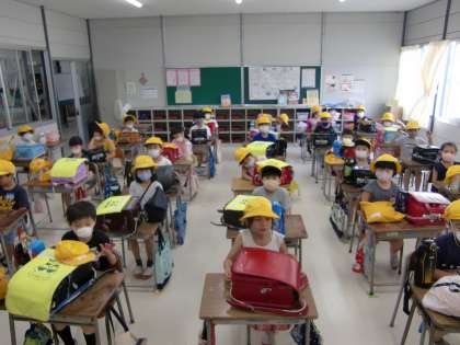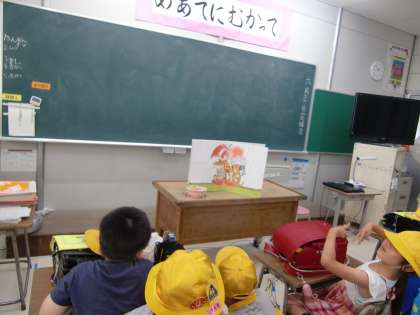 下校前の一時(2年生) 公開日 2020/06/30 更新日 2020/06/30 2年生 下校の準備も済ませ「りんごがドッスーン」の大型絵本の読み聞かせを聞きました。「この話は初めて聞いたよ。」「虫や動物たちが1つの大きなりんごを食べていくと、雨宿りができる場所ができたね。」と興味津々に物語を聞いたり絵を見たりしました。その後ちょっとリラックの姿と、やはり下校前です。気持ちを整えて教室を出て下校の集合場所へと向かいました。