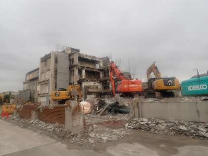 下の写真は、西側から撮影しました。茶色い煉瓦の壁が残っています。どこか分かりますか。これは、4年生玄関です。取り壊しは、旧保健室まで進んでいます。