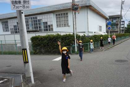 交通安全教室では、一時停止や左右の確認、交差点や歩道橋の歩き方など、一つ一つ確認しながら堀川小学校の周辺の道を歩きました。