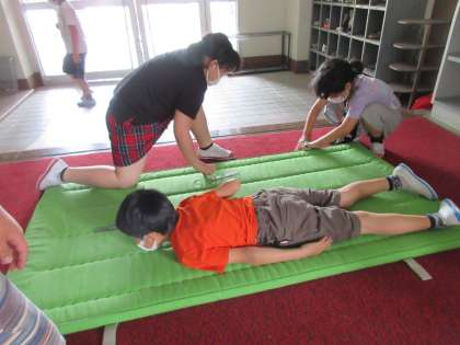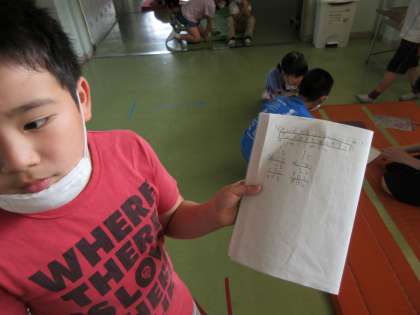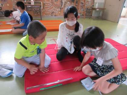 今日から「長い長さをはかってあらわそう」の学習がスタートしました。マットの長さを予想した後、ファミリーで1枚のマットの長さをはかりました。教科書を並べたり、仲間のものさしをつなぎ合わせたりしながら、長さを測る子供たちの姿が見られました。学習後には、「もっと他の物の長さを測ってみたい」、「自分の予想と違ってびっくりした」、「短いものさしをつなぎ合わせるとずれるから難しい」などの感想をもちました。