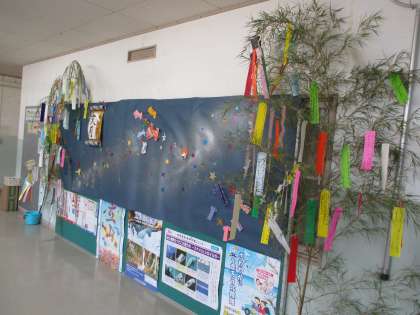 東玄関掲示板の七夕が増えました。1年生のいろいろな願いが書いてあります。みなさんだったら、今年はどんな願い事を書きますか?。
