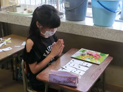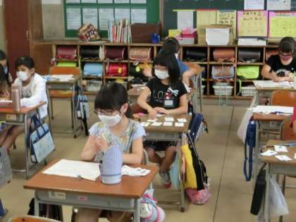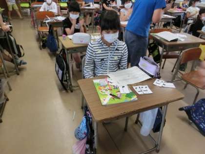 音楽の時間に音符カードを使ってリズムを打つ学習に取り組みました。4分音符と8分音符を組み合わせて、自分だけのオリジナルリズムを作りました。
