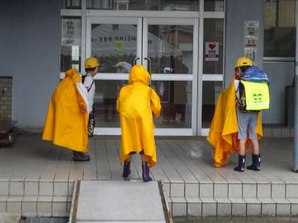 今日は、朝から雨模様でしたが、子どもたちは黄色のかっぱを着て元気に登校してきました。体育館の玄関下の屋根のところで、かっぱのしずくを落としてから、玄関に入りますが、素早くできるようになってきています。