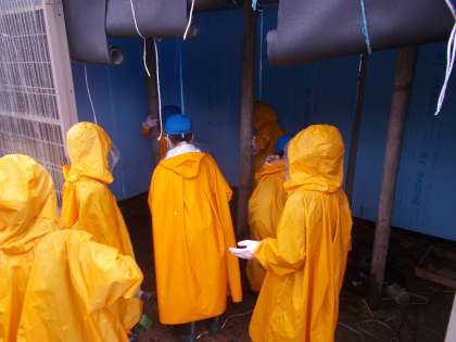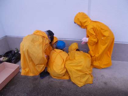 子どもたちは、雨にも負けず、モルモットの飼育に励んでいます。