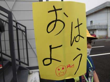 たくさんの仲間に元気な挨拶をしてもらおうと、今回は「おはよう」の文字を大きくして、看板を作り直してチャレンジです。
