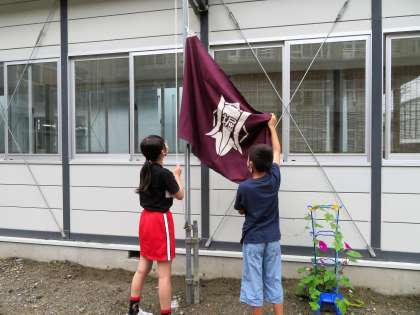 校旗を掲げる(6年生)