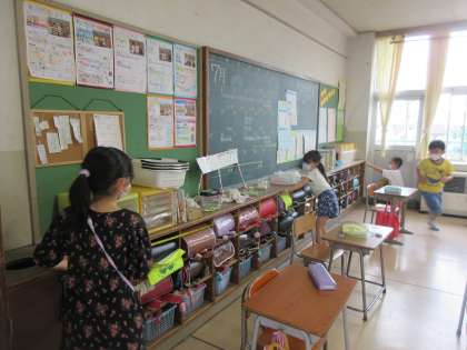 1mより長い長さを測ろう(3年生) 公開日 2020/07/10 更新日 2020/07/10 3年生 3年生の算数では、1mよりも長い長さを測る学習を行っています。ファミリーで協力しながら、いろいろなものの長さを測りました。学習後の感想では、「巻き尺は定規と違う物の長さが測れて面白いな」や「巻き尺を使うと丸い形の物でも長さが測れるよ」など、実際に触ったからこそ感じることがあった子どもたちでした。