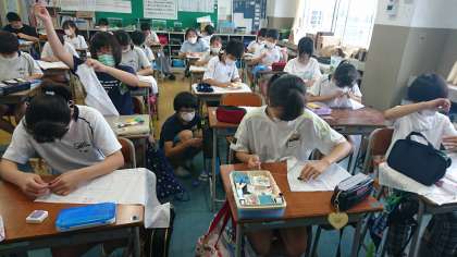 家庭科では、手縫いの基本を身に付ける学習に取り組んでいます。今日は、ボタンの縫い付けを練習しました。何気なく使っているボタンには、使いやすさと壊れにくさを考えた縫い方をしていることに気付き、自分でも縫い付けができるようになりました。