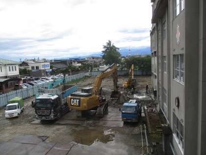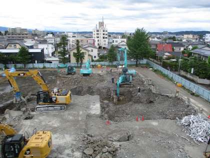 下の写真は、校舎西側の様子です。中央棟西側の基礎部分の解体が始まりました。