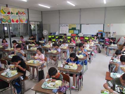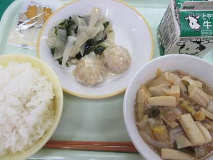 今日の給食 7/13(月) 公開日 2020/07/13 更新日 2020/07/13 職員室 今日は、「八宝菜」が出ました。「八宝菜」には、八種類の野菜が入っていなければいけないわけではなく、「八」には「たくさんの」という意味があるそうです。今日の「八宝菜」には、たまねぎ、にんじん、たけのこ、しいたけ、はくさい、ヤングコーン、ピーマンが入っていました。たくさんの野菜が入っていましたね。 今日は、2年2組の様子です。美味しそうに食べていました。