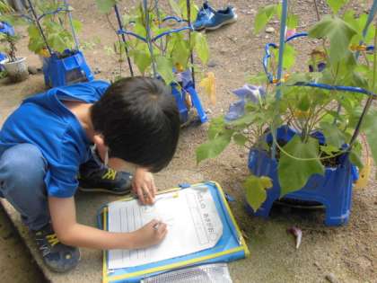 葉やつるが順調に成長し、ピンクや紫の花がきれいに咲いています。「葉っぱには、もじゃもじゃ、つるつる、ざらざらがある」と葉っぱには、いろいろな手触りがあることを見付けました。