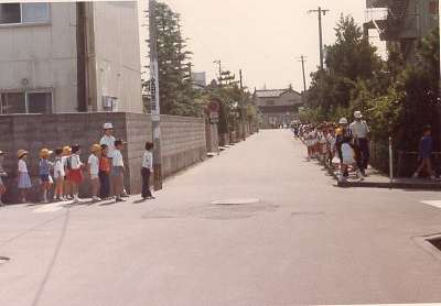 北側から東棟方面を撮しています。右側にちらっと見えます。これは、1年生が交通安全教室をしている様子です。