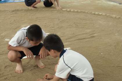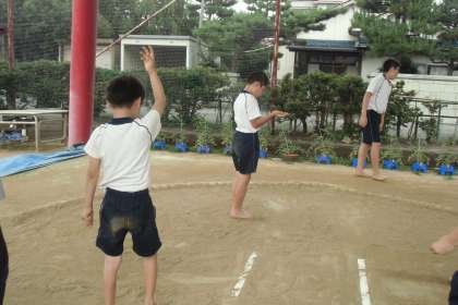 相撲クラブで、塩のように砂をまいたり、対戦相手とにらみあったりしました。