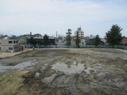 下の写真は、夕方の職員室から見た中央棟西側跡の様子です。まだ取り壊し工事は続いてます。